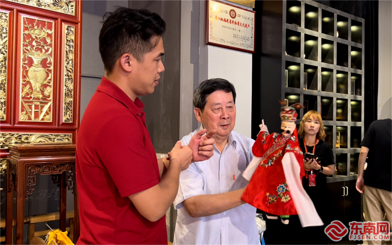 國家級非遺傳承人莊陳華(右)與徒弟吳聲杰(左)(東南網記者 李霖 攝) 講述 掌中小木偶牽起兩岸師徒情 當天,國家級非物質文化遺產項目木偶戲代表性傳承人莊陳華攜徒弟們登臺亮相。來自臺北木偶劇團的主演吳聲杰就是其中之一。 2009年,一次偶然觀看過莊陳華老師的木偶藝術表演后,吳聲杰就為其精湛的表演藝術所折服,被漳州布袋木偶戲精美細膩的道具所吸引。2011年開始,他多次跨越海峽到漳州向老師取經,并于2015年正式拜師在莊陳華門下。 從空手學習指尖技法,到丑角的基本步、肢體動作,再到武生的舞刀弄槍,在老師的悉心教導之下,吳聲杰的技藝也日漸精進。2019年之前,每年他都會往返大陸一兩趟,向莊陳華老師學藝,吃住都在一起。疫情期間,師徒二人也通過視頻通話傳授技藝?!耙蝗諡閹熃K身為父?!眳锹暯苷f,莊老師是如同自己父親一般的存在。 他說,除了技藝上的傾囊相授,莊老師為布袋木偶戲傳承傾盡心血的精神更讓自己受益匪淺。他也將努力提升自身技藝,為傳承發展這門古老的民間藝術貢獻自己的一份力。