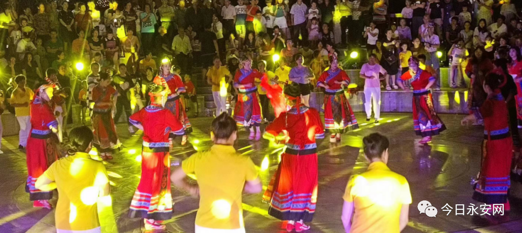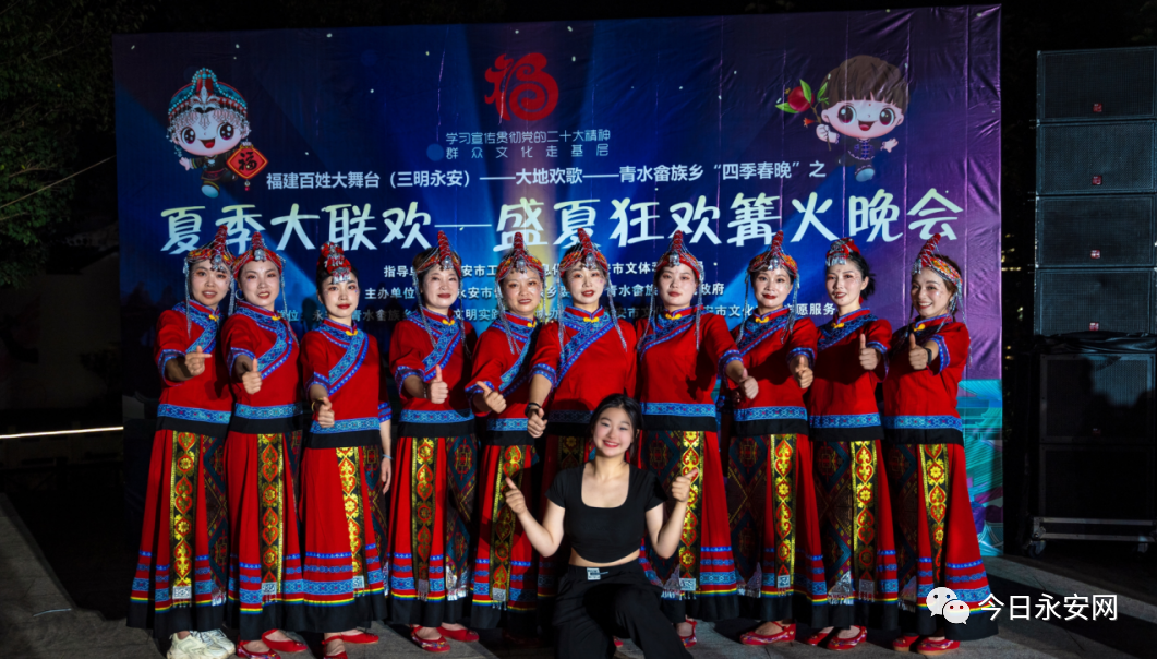 青水畬寨景區篝火盛會 活動現場,具有畬鄉特色的《祈福靈刀》《小村來客》、《煙盒舞》《歡樂畬寨竹竿舞》等精彩節目輪番上演,異彩紛呈。在輕柔的夜色中,伴隨著一曲曲嘹亮歡歌、一陣陣雷動掌聲,各地游客和畬族人民“以舞會友”,手牽著手,肩靠著肩,圍著熊熊篝火,激情互動,青春活力與畬鄉風情有機融合,勾勒出了民族大團結最美的“同心圓”。