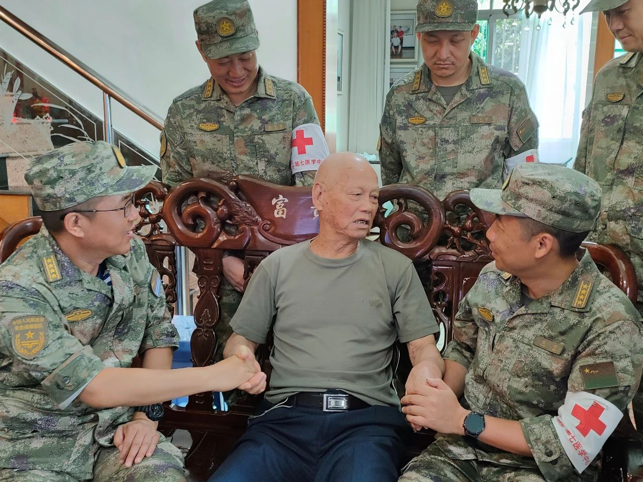 隨后,醫療隊先后來到參加過東山保衛戰的老兵林英良、王丁太、朱全義、孫獅家中走訪義診。在老兵家中,該醫療隊心血管內科、消化內科、神經外科等多位科室專家耐心細致地詢問老兵身體狀況,為老兵免費體檢,并針對個人情況給出治療建議,贈送藥物。同時,醫療隊們還聆聽了老兵講述在東山保衛戰中的戰斗故事,近距離感受前輩們曾經英勇戰斗的光輝事跡。 “我老了,不然我還想當兵?!笨吹叫聲r代軍人的颯爽英姿,王丁太一邊贊嘆固我國防、使命光榮,一邊禁不住回憶起自己的軍旅時光,眼里飽含深情的淚花。1953年,王丁太時任公安80團班長,在東山保衛戰中英勇奮戰,表現突出,榮立二等功。 “您是功臣!黨和軍隊始終惦記著像您這樣保家衛國、勇于犧牲奉獻的老兵!”一旁醫院領導如是說道。