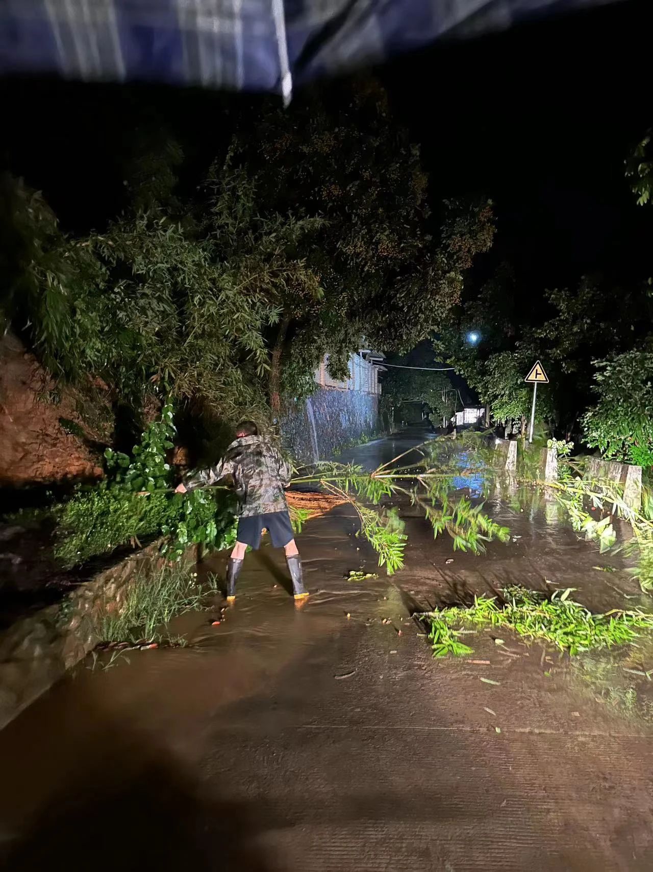 白沙鎮唐舉村,村干部退役軍人張和平疏通下水道,黃超及時清理刮倒的樹枝,并查看村里的地勢水位險情。 |