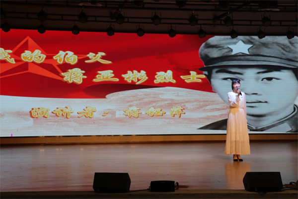 不顧個人安危,英勇作戰,身負重傷仍堅守陣地,勝利完成任務卻獻出年輕的生命。蔣亞彬烈士的侄女蔣鈺萍用鏗鏘的話語講述蔣亞彬同志在對敵作戰中英勇頑強和不畏犧牲的精神,講述他帶給親人帶給后人的榜樣力量。