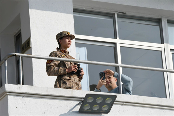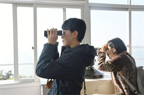 記者們紛紛模仿哨兵,利用望遠鏡察看過往船只,并不時拍照留念,尋找適宜傳播的信息。