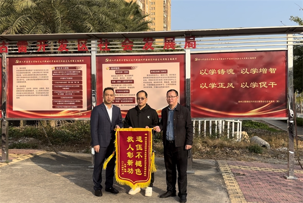 1月3日下午,落水男童的父親(左一)與男童的爺爺到林武漢(左二)的單位送上錦旗表達感恩(右一:林武漢的單位領導)