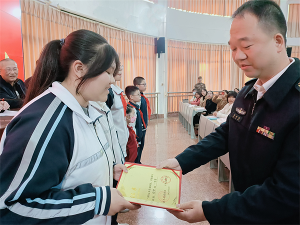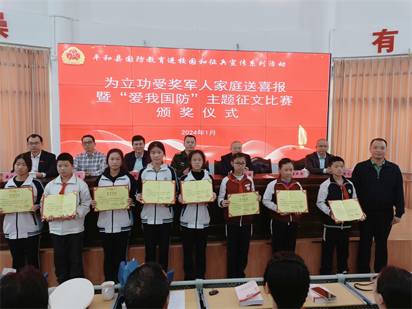 圖為平和縣人武部政委郭毅置為曾致銜頒發喜報 在師生代表的見證下,平和縣人武部政委郭毅置為曾致銜及家屬佩戴上“榮立三等功,軍屬光榮”綬帶,送上立功喜報及慰問金。曾致銜則和當地有關部門一起,為獲得主題征文獎的師生頒發榮譽證書,現場響起雷鳴般掌聲。 立功喜報送到功臣母校,既增強了現役軍人及其家庭成員的榮譽感,也用生動、走心的方式,為學生們上了一堂沉浸式的國防教育課。