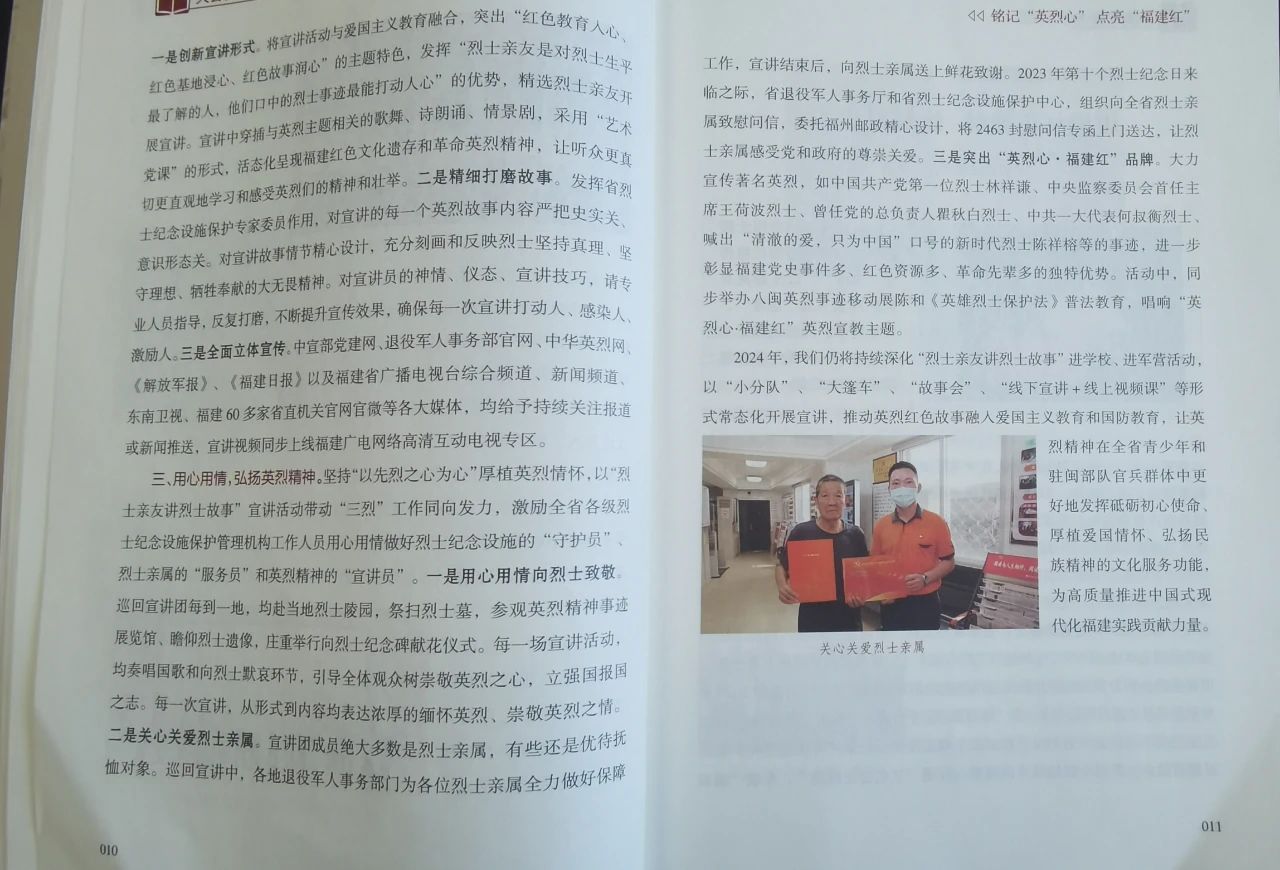 近日,退役軍人事務部烈士紀念設施保護中心圍繞英烈紅色文化傳承發展和烈士紀念設施保護利用主題,編印《強基鑄魂——英烈褒揚領域研究成果匯編(二)》,收錄各省退役軍人事務部門、媒體、專家學者及社會組織的經驗材料及研究課題文章37篇。我省“烈士親友講烈士故事”宣講活動經驗做法,作為全書僅有的4篇地方經驗成果入編,這既是對福建烈保工作系統“英烈心·福建紅”烈士褒揚工作特色品牌的生動展示,也是對福建在推動烈士褒揚工作高質量發展方面創新探索的成果推廣。