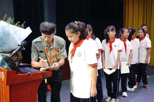 “戰斗英雄”在紅色課堂上為學生簽名寄語 “黨培養了我,戰火洗禮了我,我要把熱血和忠誠獻給黨?!敝袊嗣窠夥跑娨坏裙Τ颊裁鞯律碇娧b,胸前的勛章熠熠生輝,筆挺地站在新時代的講堂講述他的“烽火記憶”。 “生于華夏,永遠相信‘中國紅’,安于盛世,時刻不負‘火焰藍’!”福建省最美退役軍人溫殿威講述了新時代消防員赴湯蹈火、視死如歸的英雄故事。 “作為一名黨員退役軍人,不管何時何地,只要群眾有危險,我都會毫不猶豫挺身而出?!钡谄邔萌珖赖履7短崦?、2008年北京奧運火炬手吳奕澈講述了自己“三跳救八命”見義勇為的感人故事。 …… 除了功臣模范、退役軍人,泉州市革命烈士陵園宣講團隊還與講師團、黨史部門、駐地高校、社會組織緊密合作,廣邀在校師生、專家學者、烈士親友、志愿者們走上紅色移動課堂的講臺,生動講述英烈故事、黨史故事、榜樣的故事,用人們喜聞樂見的形式讓紅色故事“聲”入人心,把紅色文化送進尋常百姓家。 2024年以來,泉州市革命烈士陵園紅色移動課堂多措并舉,開展形式多樣的紅色文化“進校園、進軍營、進機關、進社區、進企業”主題宣教活動,受到社會各界普遍關注和一致好評。這一特色宣教品牌,不僅被中共泉州市委黨史和地方志研究室發文通報表揚,還先后被退役軍人事務部、中華英烈網、中國退役軍人強國號、福建省退役軍人事務廳、東南早報等官方媒體宣傳推廣。 |