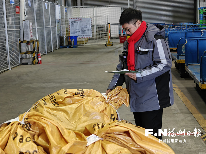 1月28日上午8:40,在福州機場國際貨運站,王比爾細致核對前夜貨運保障記錄。作為貨運班組長,他需要統籌協調,在有限時間內完成貨物出入港的全流程。