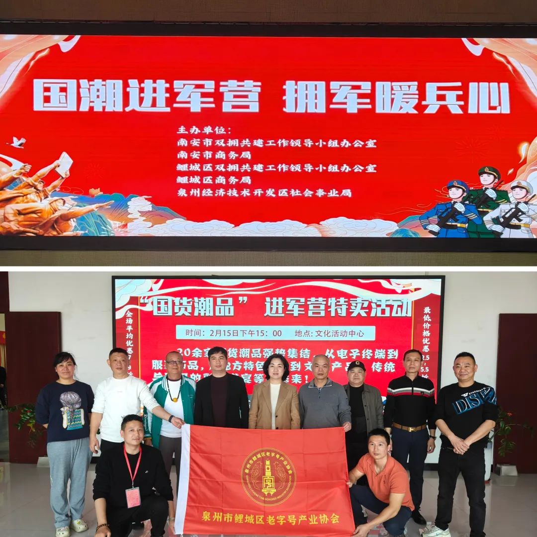 2月15日,泉州市鯉城區雙擁共建工作領導小組辦公室、鯉城區商務局、南安市雙擁共建工作領導小組辦公室、南安市商務局、泉州經濟技術開發區社會事業局聯合相關品牌企業開展“國貨潮品”進軍營特賣活動。