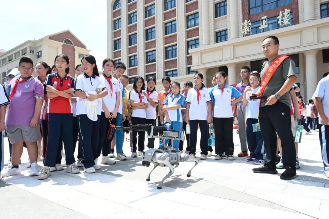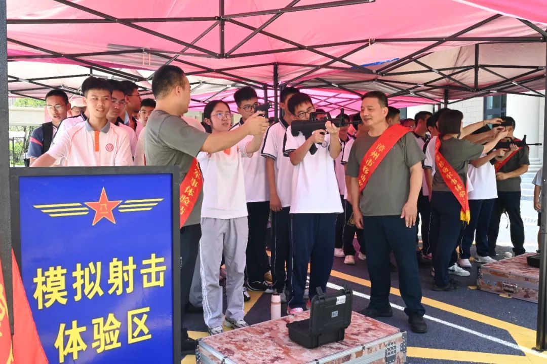 突然,“砰——”的一聲巨響回蕩在空中,瞬間點燃全場氣氛。烈日炎炎,卻絲毫阻擋不了大家的熱情。在軍事體驗區,男女學生們躍躍欲試,輪流肩扛模擬火箭筒進行發射體驗。緊接著,伴隨一陣“嗒嗒嗒”的模擬槍聲,一只機器狗穩健地走入人群,靈活演示多種戰術動作,立刻成為全場焦點。同學們紛紛好奇地圍上前去,伸手觸摸機器狗的“手”和“腳”,感受科技賦能國防的獨特魅力。 “我剛才模擬了中國軍人打槍的環境,我拿了95式步槍,我覺得它很重,我體會到了軍人的艱辛與不易。作為一名新時代青少年,我應該認真學習,扛起新時代國家的重任?!备咭恍聦W黃靖航感慨道。