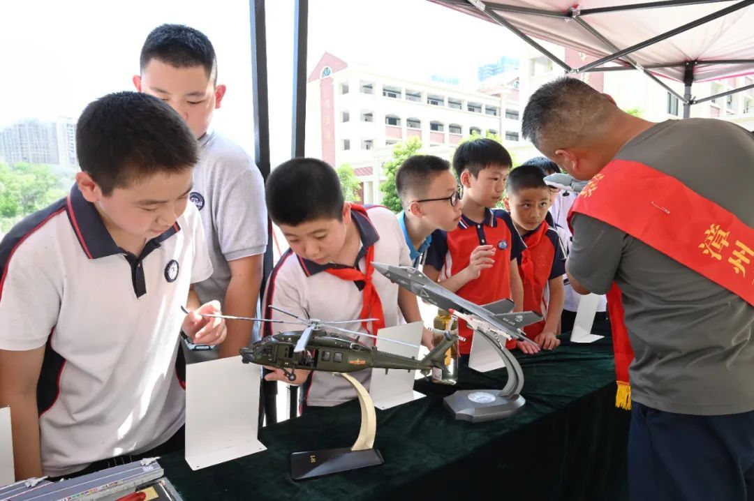 “太震撼了!”“感到特別自豪!”“再過幾天,我們就能在閱兵式上看到更先進的裝備!”一大早,學校操場上的軍事體驗區便回蕩著此起彼伏的歡呼與驚嘆。學生們緊緊簇擁在“移動軍事體驗站”周圍,專注聆聽漳州市軍休所老干部的講解,并踴躍提問、積極互動。