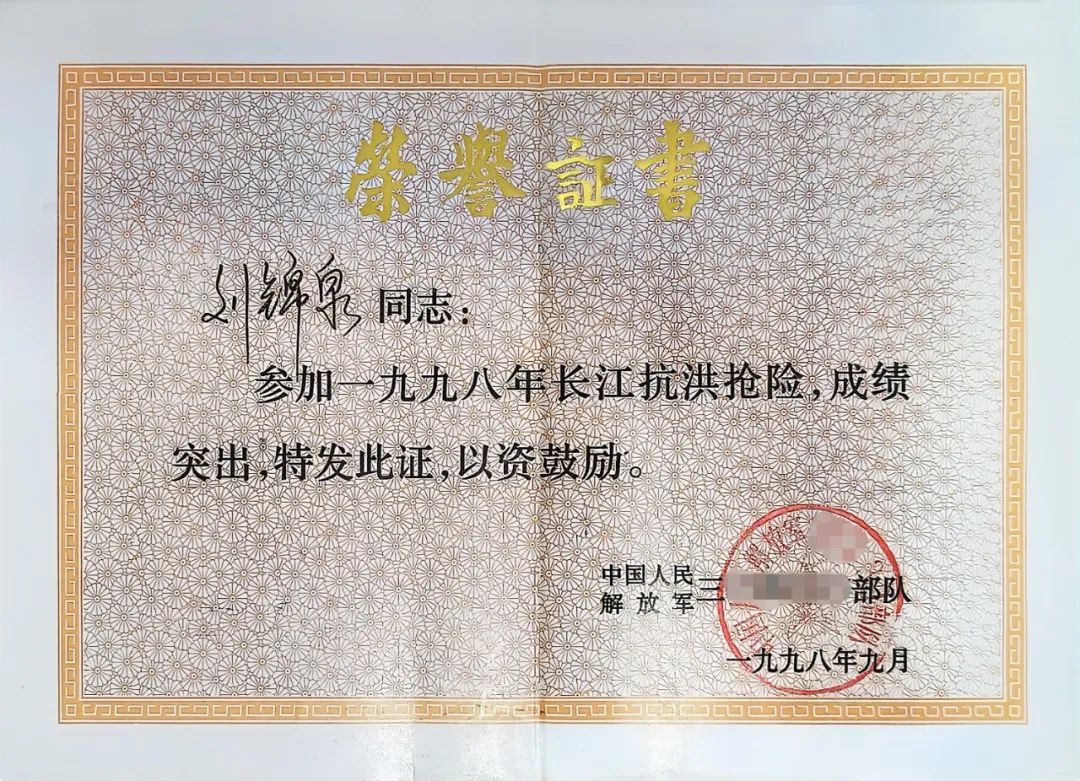 劉鳳彩轉業軍人證明書及四枚勛章 1997年冬,劉錦泉接過家族旗幟,參軍入伍。次年夏天,長江告急,他隨部隊奔赴抗洪一線。齊腰深的洪水中,沙袋一袋接一袋地扛,手磨破了,腳泡白了,也從未退縮。那一刻,他腦海里回響的,正是爺爺的話。 洪水退去,他胸前多了一本榮譽證書。更重要的是,他終于懂得了爺爺眼里的光——那是明知危險,也要為守護萬家燈火而向前的責任與勇氣。