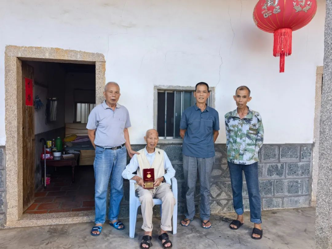 1945年,蔡友琳隨軍參加閩東追擊戰,一心盼著戰爭早日結束??箲饎倮南鱽?,整個駐地歡騰一片,“大家都希望可以過太平日子了”。部隊改編后,蔡友琳選擇離開軍隊,在廈門短暫工作。1949年,思鄉心切的蔡友琳步行回到長泰老家務農,終于迎來安穩的生活?!拔揖鸵宦纷呋丶?,肚子實在餓得不行,就向沿途的人家討點吃的?!边@條返鄉路,他走得艱難,卻滿懷希望。 回鄉后,蔡友琳結婚生子,子女孝順,家庭和睦。如今老人身體尚可,只是聽力有些下降。自2015年5月起,蔡友琳開始接受公益基金助養金資助。社會的關懷如涓涓細流,溫暖著這位曾為國家奮戰的老兵。2015年,蔡友琳獲頒“中國人民抗日戰爭勝利70周年”紀念章;十年后,又一枚紀念章承載著時代的敬意,佩戴在他的胸前。 “戰爭是極其殘酷的,和平就是最大的幸福?!边@是蔡友琳常掛在嘴邊的話,也是他一生最深刻的領悟。 從戰火紛飛到安居樂業,從硝煙彌漫到村莊寧靜,他的人生猶如一部行走的歷史書,見證著一個國家從苦難走向復興的偉大歷程。長泰區、鎮領導時常前來探望,關心他的身體和生活,聆聽他講述抗戰往事?!翱箲鹄媳敲褡宓募沽?,是歷史的見證者,”長泰區領導表示,“他們的英勇事跡和愛國精神值得永遠銘記與傳承。我們將繼續做好參戰老兵的關懷工作,嚴格落實優撫政策,讓英雄安享晚年?!?/p>