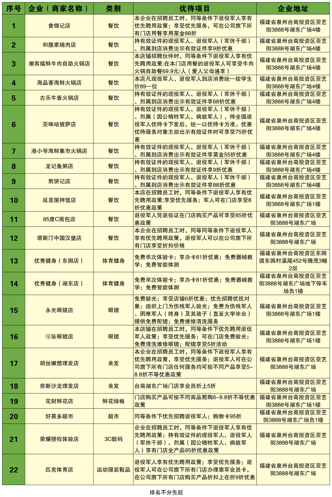 作為泉州臺商投資區首個商業綜合體擁軍示范點,湖東廣場“擁軍商場”首批匯聚了21家優質商戶資源,將為現役、退役軍人及其他優撫對象提供“優質產品、優先待遇、優惠價格”的“三優”服務,凡現役、退役軍人及其他優撫對象持相關證件,即可享受消費折扣等相關優惠。 首批“擁軍門店”清單