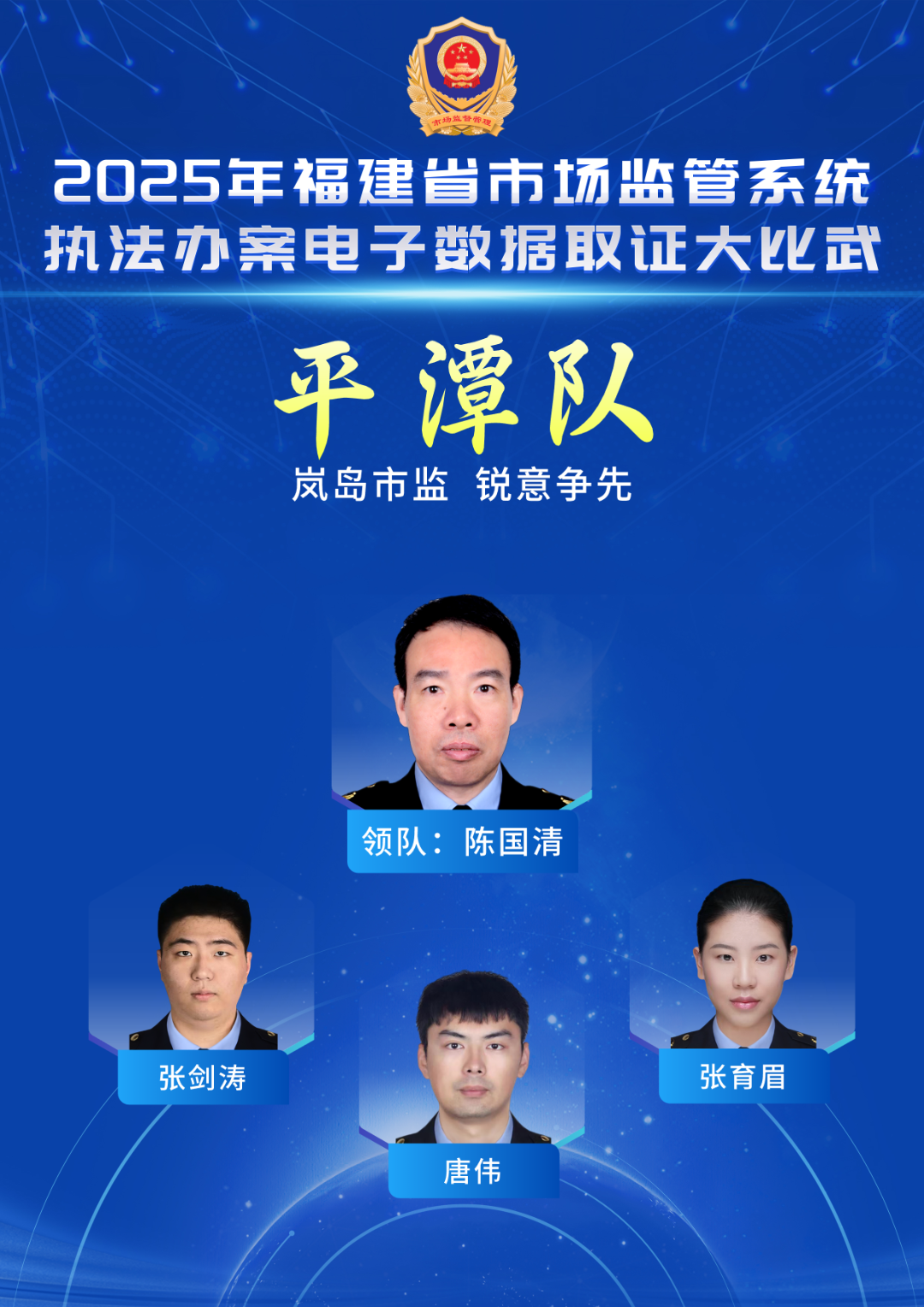 口號:寧聚市監,德智爭先 成員簡介 王暉(領隊),寧德市市場監管局黨組成員、副局長。 林栩,男,現任寧德市蕉城區金涵市場監管所所長,從事市場監管工作三年,負責轄區內餐飲、流通、藥品、醫療器械、廣告、食品抽檢等業務板塊的日常監督檢查、行政處罰案件辦理、投訴舉報件處理。擅長案件辦理、計算機編程、視頻剪輯等。 吳家泉,男,現任寧德市柘榮縣市場監管局城郊所所長,從事市場監管工作八年。主要從事基層一線執法,有豐富的日常監管、稽查執法和調節化解矛盾糾紛的經驗。曾獲寧德市特種設備現場執法大比武團隊第一名。 王陳鋒,男,寧德市古田縣市場監管局一級科員,從事市場監管工作兩年,負責執法辦案。持有美亞柏科網絡安全應急響應工程師、電子數據取證認證及全國計算機四級證書,并擁有“基于Arduino的多功能監控報警系統”實用新型專利。 平潭代表隊
