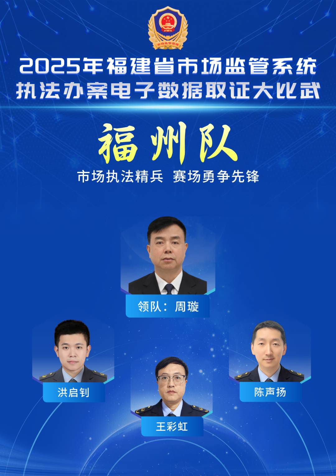 為將“三爭”行動和“九大工程”的戰略部署切實轉化為實戰能力,進一步夯實全省市場監管執法隊伍專業知識,2025年10月24日,一場圍繞電子數據取證的巔峰對決即將上演——2025年福建省市場監管系統執法辦案電子數據取證大比武重磅來襲! 與往年相比,本次大比武在賽制上全面升級,經過8-9月為期四周的“電子數據取證線上課堂”培訓及線上選拔環節,最終遴選出30名執法精兵作為本次大比武參賽選手,并在賽前組織為期三天的線下集中培訓,全面強化實戰能力。來自各設區市(含平潭綜合實驗區)的10支代表隊將在6個小時內進行包括現場勘查取證、理論答題與電子數據取證分析三大模塊的比拼。選手們將憑借清晰的辦案思路、扎實的法律功底與嫻熟的取證技術,全面檢驗崗位大練兵成效,生動展現福建市場監管執法隊伍精湛的業務水平與昂揚的精神風貌。 下面 有請他們閃亮登場 看他們在數字與現實深度交織的戰場上 巔峰對決 福州代表隊