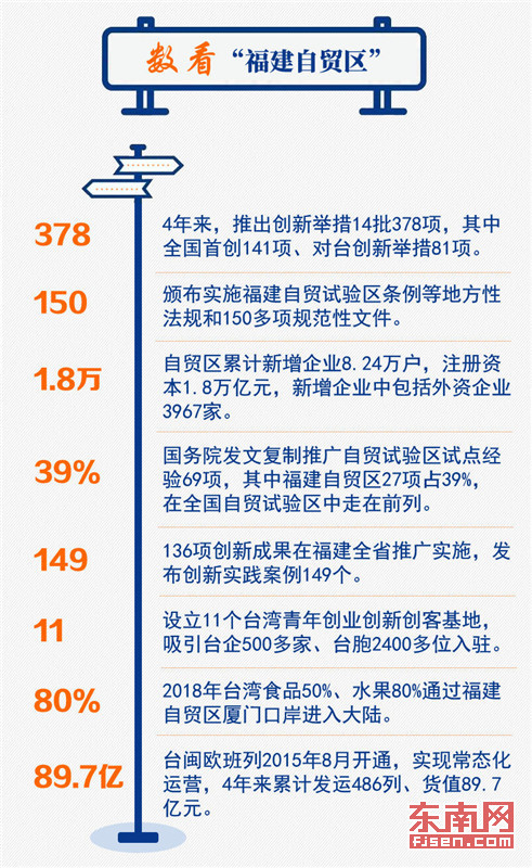 自2015年4月掛牌運行以來,中國(福建)自由貿易試驗區堅持大膽闖、大膽試、自主改,不斷創新體制機制,加大對外開放力度,形成了一批獨具福建特色、對臺先行先試的制度創新成果。4年來,福建自貿區推出378項創新舉措,其中全國首創141項?!耙蚺_而設”的福建自貿區,還承擔著加強兩岸經濟合作的重要使命,推出了一系列深化閩臺投資、貿易、人文交流等便利化舉措,率先探索海峽兩岸融合發展新路,成為兩岸交流合作的試驗田。