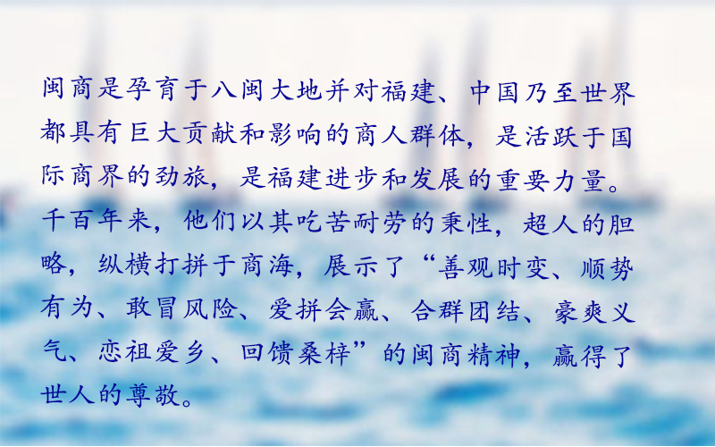 “出則兼濟天下,歸則回報桑梓。一直是我們閩商不滅的熾熱情懷,作為閩商的一員,很榮幸也很自豪,榮幸能夠參與到新福建的建設中來,自豪能夠成為新時期新福建建設的見證者?!?span>[詳細]