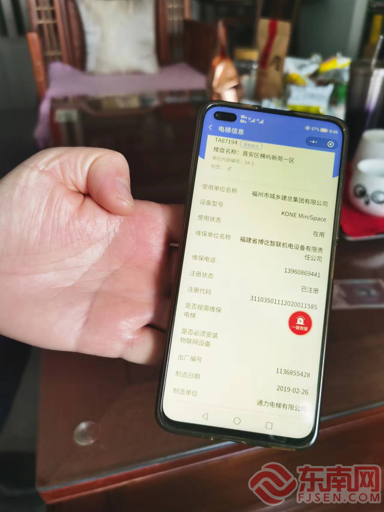 維保人員介紹電梯品牌及維保情況。 3月17日,記者會同電梯維保單位福建省博訖智聯機電設備有限公司、福州城鄉建總物業服務有限公司相關人員再次來到現場。福州城鄉建總物業服務有限公司橫嶼新苑一區項目負責人黃經理向記者介紹,該公司十分重視林先生反映的情況,已多次聯系電梯維保人員上門檢測,努力解決問題。維保人員張師傅也表示,已數次前來實地感受,林先生反映的聲響確實存在,他多次進行了排查,并采取過線纜潤滑、更換配件等舉措。 當日,電梯維保單位委托第三方檢測機構四川升瑞達機械設備檢測有限公司福建分公司前來檢測指導。檢驗員莫慧甲在電梯轎廂內外及林先生家中進行分貝測試后表示,電梯運行噪音的檢測值在正常范圍內。
