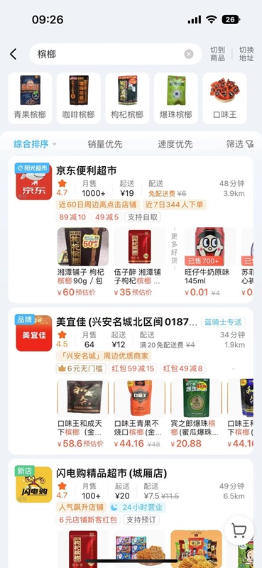 三明一學校附近,店鋪上方設置了醒目的檳榔廣告 電商平臺鮮有設限 記者也查看了多個電商平臺,發現眾多檳榔產品琳瑯滿目,青果檳榔、咖啡檳榔、爆珠檳榔、枸杞檳榔、醬香檳榔等品類齊全,只需下單支付便可快速送達,對買家是否成年并無特殊限制。 在美團外賣定位福州,除了門店密集的萬嘉便利、六意便利、京東便利店等有檳榔在售,還有一刻便利、7+便利店、便利先生、鑫萬超文體便利(晨光文具)、佳盛文具便利、米熊倉鼠超市、奈斯優選生活超市等均有售賣,買家可根據地域、喜好隨時下單。將定位調整為莆田、南平、寧德、三明、泉州等地,也有眾多店家提供檳榔外賣。 除了美團,記者也嘗試了永輝、樸樸、沃爾瑪、大潤發等線上平臺,未見檳榔銷售。不過,餓了么、多多買菜、淘寶、京東、拼多多等電商平臺大都貨品齊全,有的可選擇即時送貨,有的只能次日自提。就連閑魚也有檳榔可買。 檳榔在全省各地大行其道,唯有廈門較為特殊。在外賣平臺定位廈門搜索檳榔時,出現的是“搜索結果為空”的提示。不過,這并不妨礙有心人從淘寶、京東等平臺下單購買。
